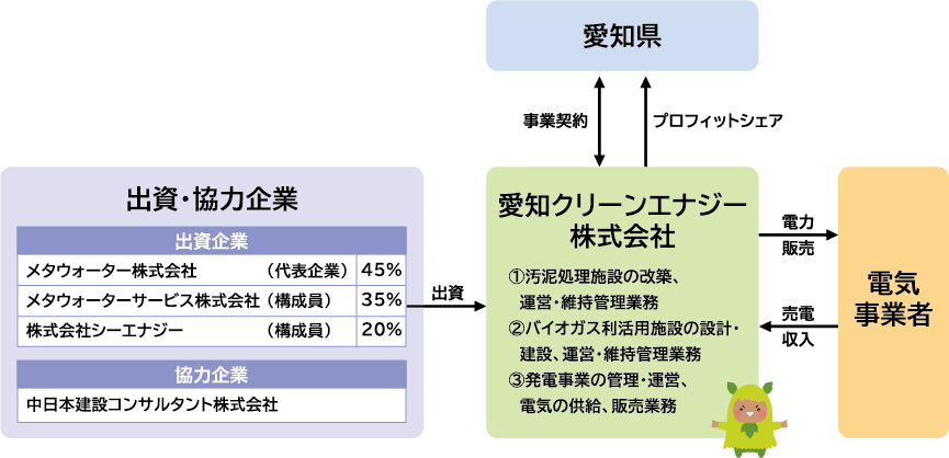 PFI方式 汚泥処理施設:RO(Rehabilitate Operate)方式 バイオガス利活用施設:BTO(Build Transfer Operate)方式 |